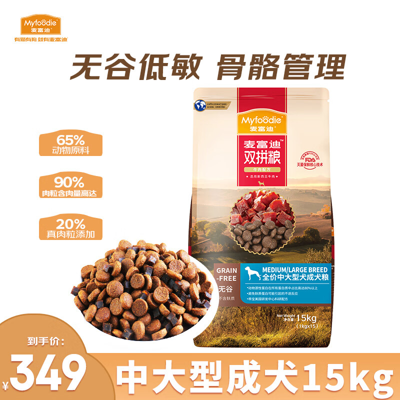麦富迪狗粮 无谷牛肉双拼粮15kg 成犬中大型犬金毛拉布拉多349.00元