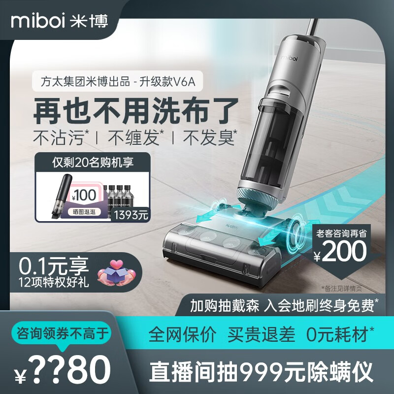 米博(Miboi)无滚布洗地机V6A无线洗拖吸一体家用拖地机扫地机智能除菌吸尘器 深空灰4280.00元