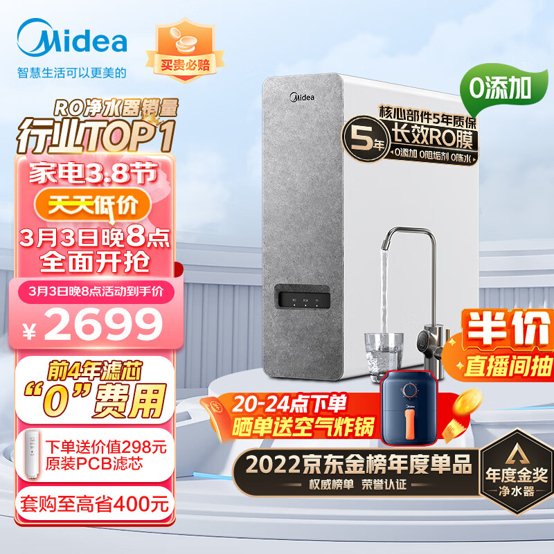 美的(Midea)净水器白泽1000G家用净水机厨房厨下式净饮机直饮机5年RO反渗透过滤器京品家电京东小家2.46L/分2899.00元