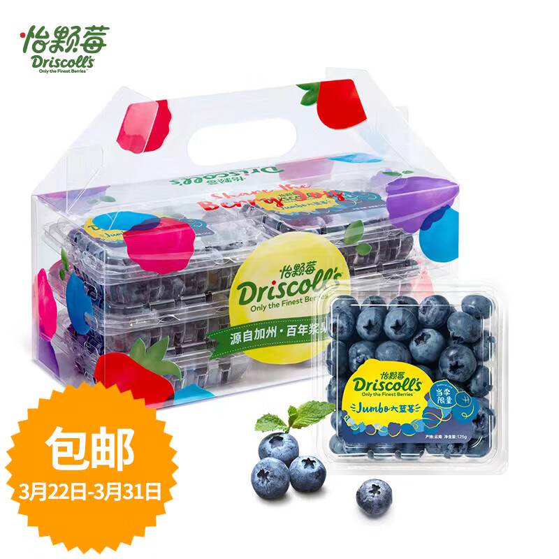 怡颗莓Driscoll's 当季限量Jumbo超大果 云南蓝莓6盒约125g/盒 水果礼盒163.90元