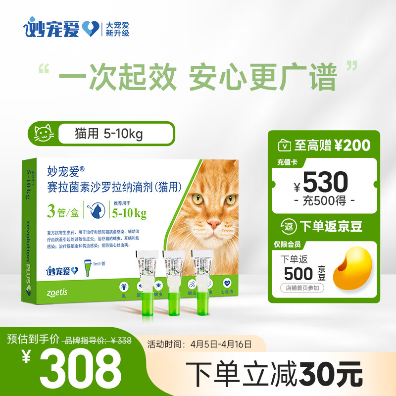 妙宠爱 大宠爱猫咪驱虫药 体内外同驱虫滴剂 大宠爱宠物猫驱寄生虫 美国进口 5-10kg 3支装304.20元