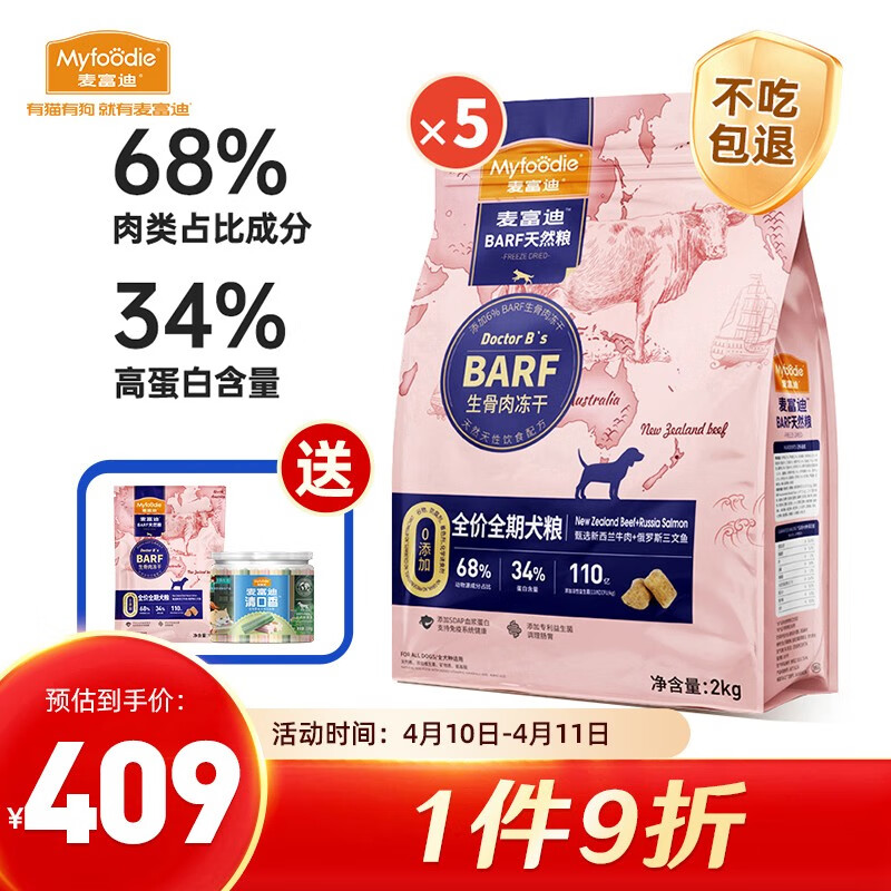 麦富迪 狗粮 barf生骨肉主食冻干双拼天然粮 成犬粮10kg|牛肉+三文鱼404.00元
