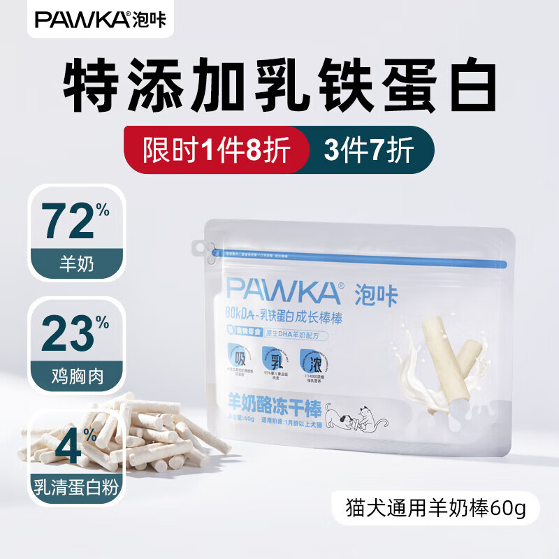 PAWKA泡咔猫咪零食冻干羊奶棒成幼猫羊奶肉条磨牙棒猫狗宠物零食60g 原味羊奶棒60g69.90元