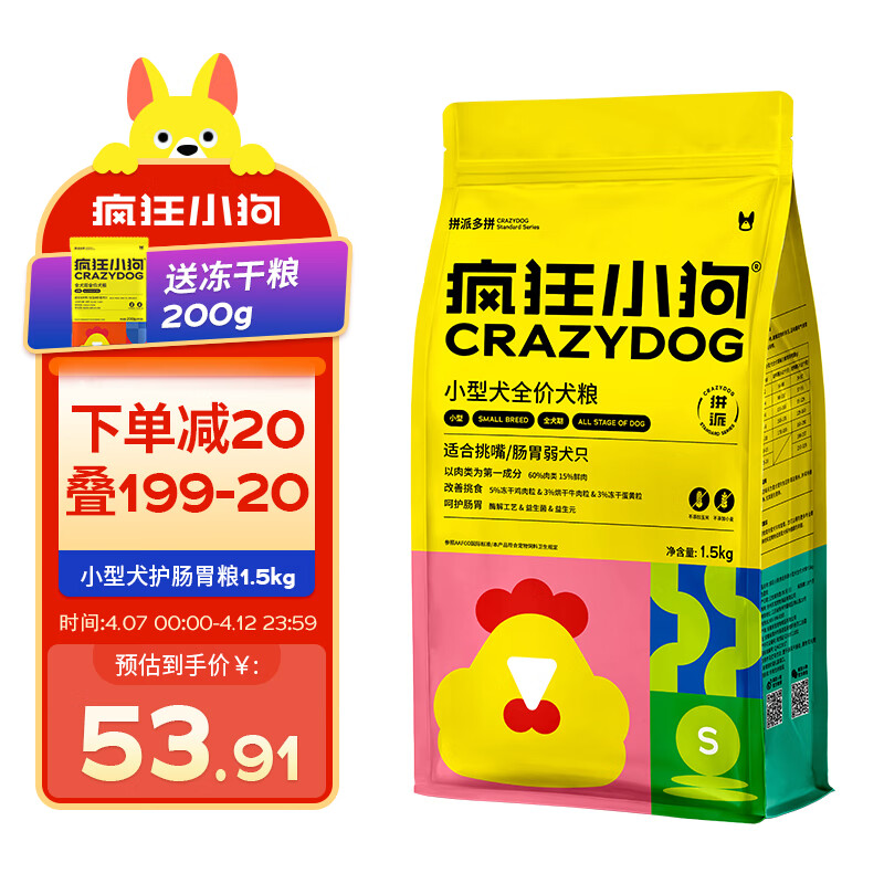 疯狂小狗 冻干狗粮泰迪比熊小型犬幼成犬通用 拼派多拼挑嘴护肠胃款1.5kg59.90元