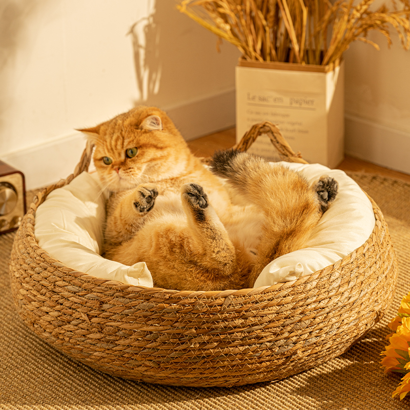 冬暖夏凉,四季都可以使用,而且编织的非常的细密,亚麻的面料亲肤,猫猫真的是很喜欢这个藤编的窝啊。