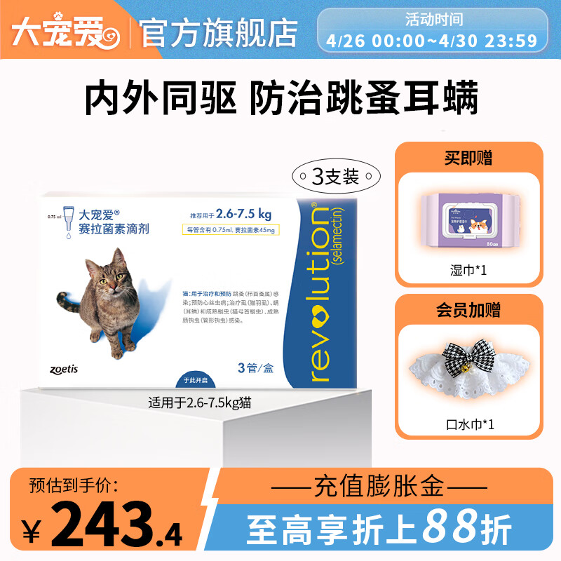 大宠爱猫咪驱虫药体内外驱虫滴剂宠物药品驱除耳螨跳蚤虱子蛔虫驱虫药猫 【镇店星品】2.6-7.5kg成猫(3支/盒)287.00元
