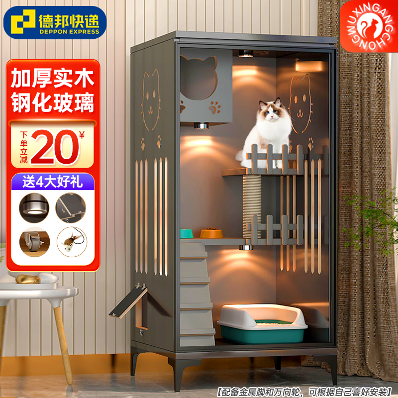 法耐 轻奢猫别墅实木豪华猫笼子三层猫柜子猫舍猫屋 【C2摩登灰】长60*深60*高130 送货上门+自行安装【贈逗猫棒+顶灯】860.00元